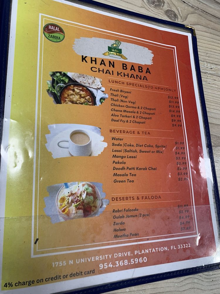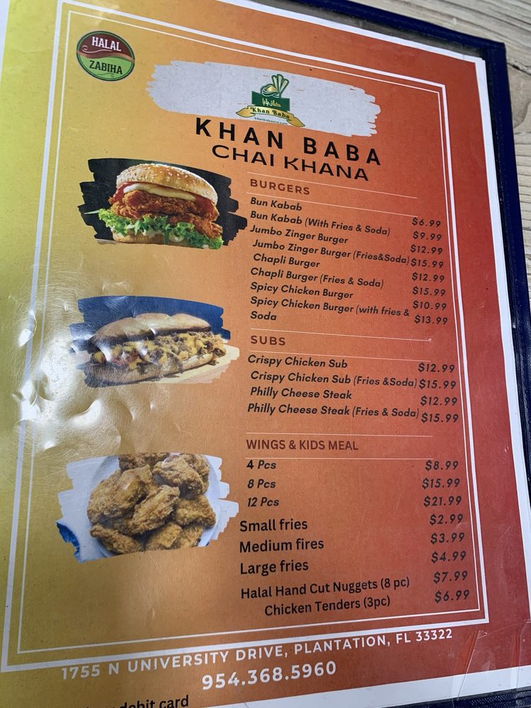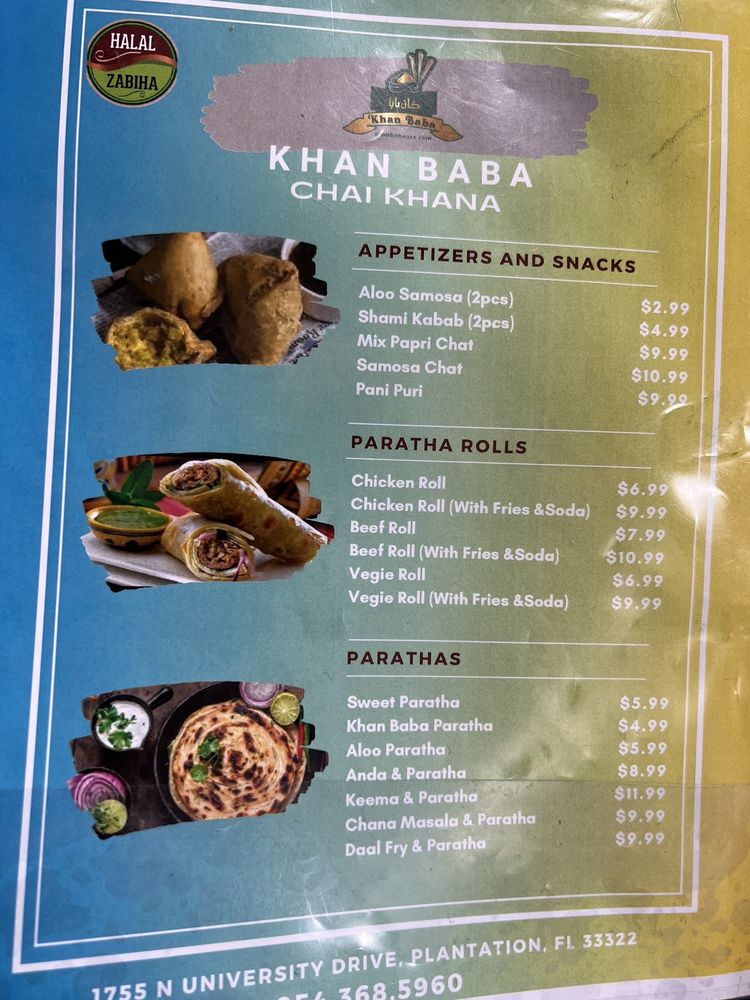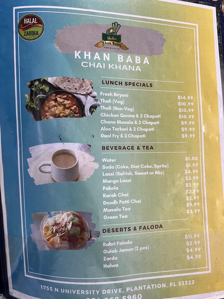 Introducing the menu at Khan Baba, a fast food joint in Fort Lauderdale, FL, offers a delectable range of Pakistani cuisine. From appetizers like Aloo Samosa and Shami Kabab to non-veg specials like Chicken Biryani and Beef Nihari, there is something for every palate. Veg specials including Daal Fry and Channa Masala cater to vegetarian preferences. Customers rave about the authentic flavors and friendly service at Khan Baba. From crispy samosas to flavorful chai, this spot is a go-to for delicious South Asian fare. The ambience is inviting, the portions are generous, and the menu offers a wide variety of options. Whether you're craving a quick snack or a full meal, Khan Baba is sure to satisfy your taste buds with its flavorful dishes and welcoming atmosphere.