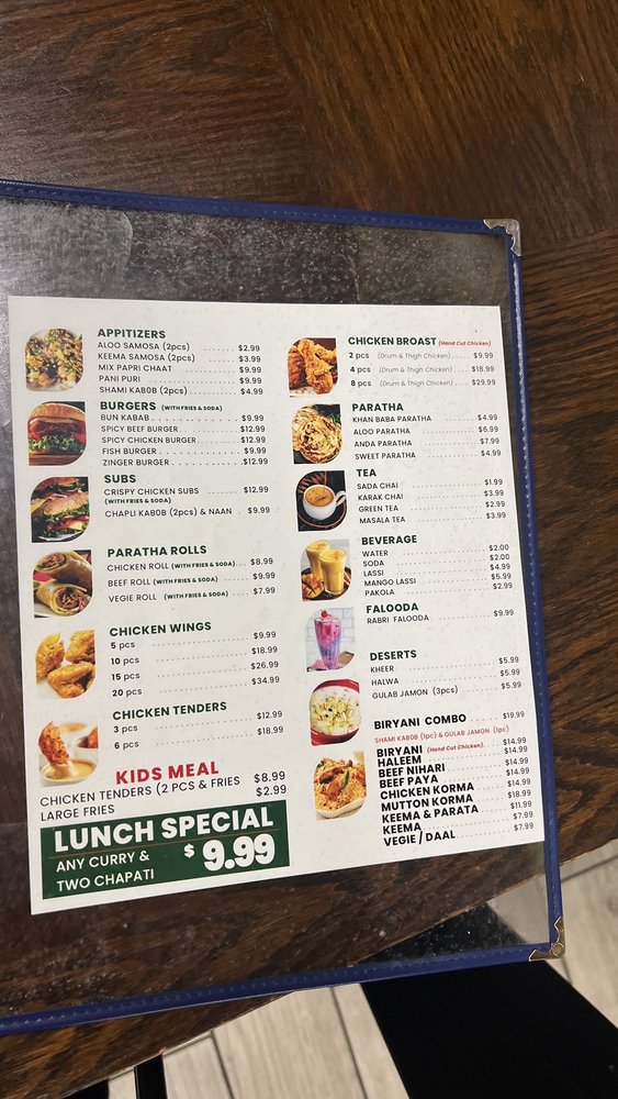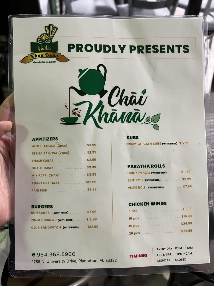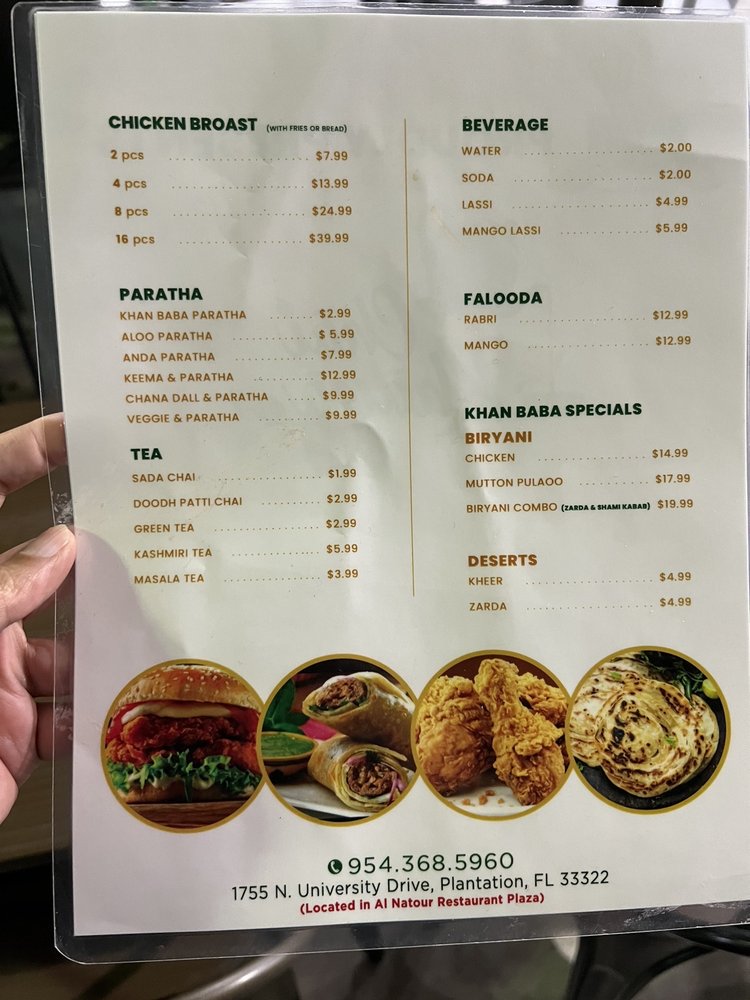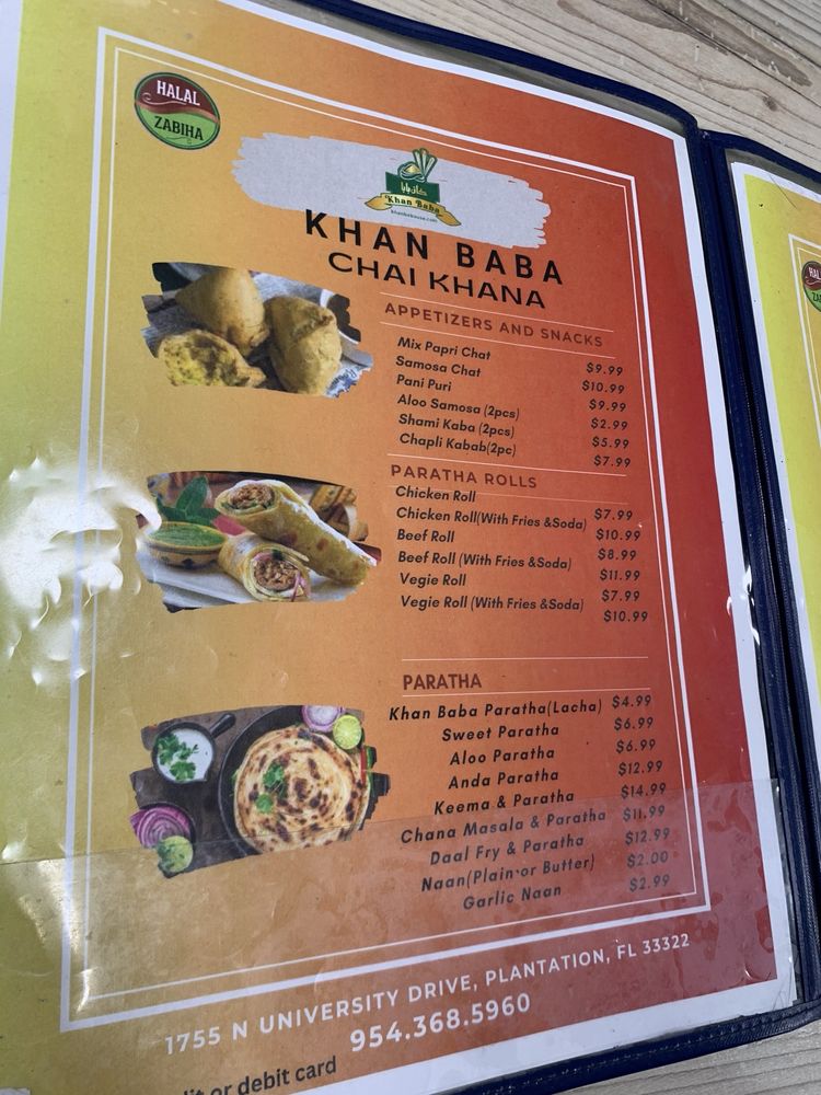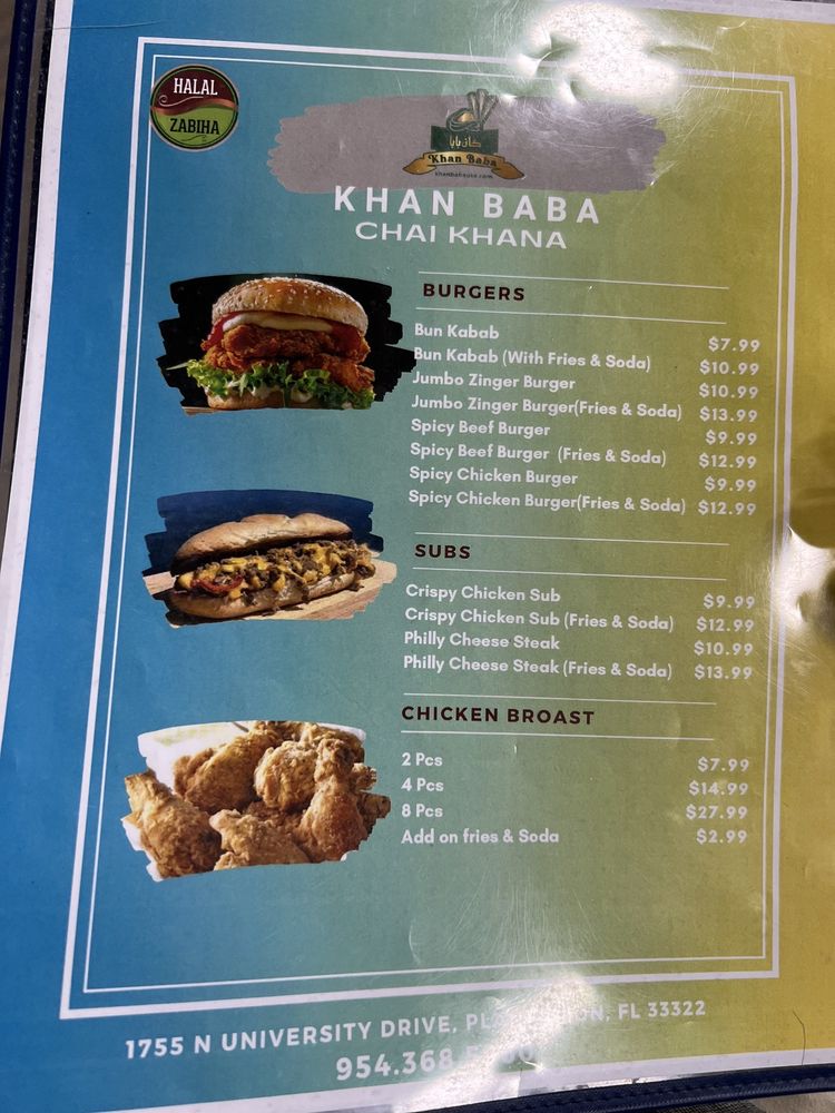 Introducing the menu at Khan Baba, a fast food joint in Fort Lauderdale, FL, offers a delectable range of Pakistani cuisine. From appetizers like Aloo Samosa and Shami Kabab to non-veg specials like Chicken Biryani and Beef Nihari, there is something for every palate. Veg specials including Daal Fry and Channa Masala cater to vegetarian preferences. Customers rave about the authentic flavors and friendly service at Khan Baba. From crispy samosas to flavorful chai, this spot is a go-to for delicious South Asian fare. The ambience is inviting, the portions are generous, and the menu offers a wide variety of options. Whether you're craving a quick snack or a full meal, Khan Baba is sure to satisfy your taste buds with its flavorful dishes and welcoming atmosphere.